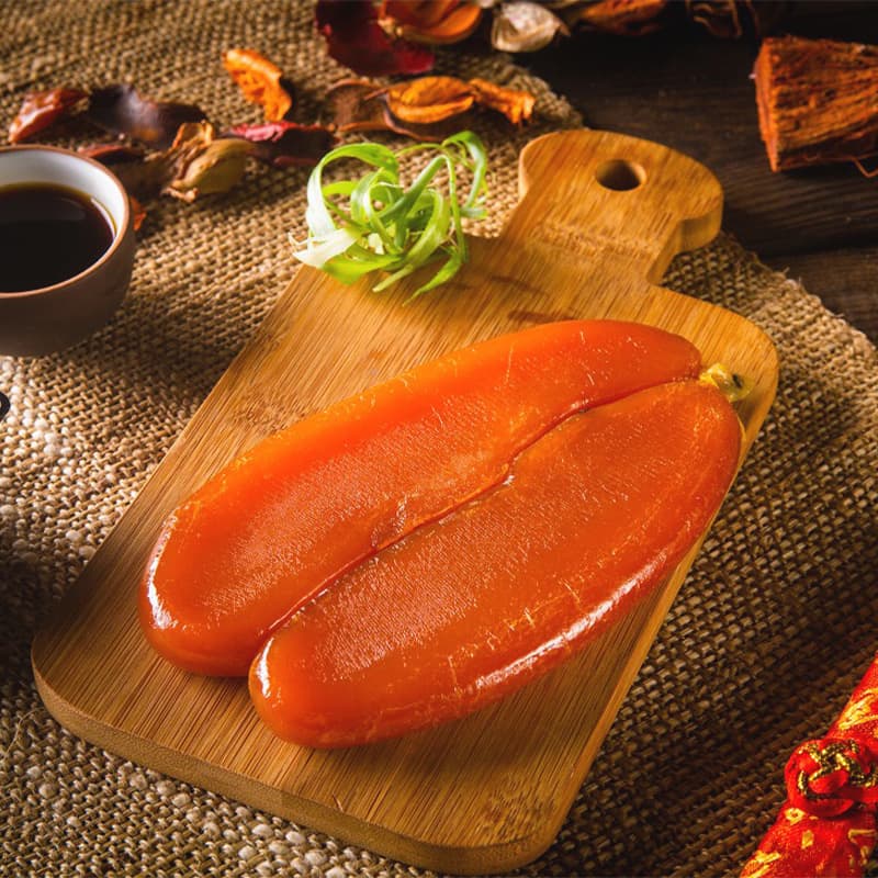 Mullet roe is an essential Lunar New Year treat in Taiwan. Fresh mullet roe undergoes a complex process of washing, salting, and sun-drying to create a rich, flavorful, and nice-chewy texture. It pairs well with garlic sprouts, apple slices, or white radish slices. Alternatively, people can drizzle whole pieces of mullet roe with whiskey, sorghum liquor, or rice wine, then lightly grill them over a flame to allow the alcohol to evaporate, leaving a lingering aroma that further enhances the mullet roe's unique freshness.