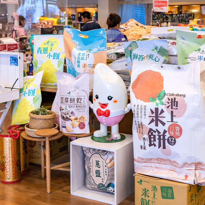 Farmers' associations across Taiwan have dedicated themselves to developing agricultural, fishery, and livestock products with local characteristics. They also collaborate with renowned snack manufacturers to launch regionally exclusive snacks, such as Miaoli Dahu Strawberry and Taitung Chishang Rice, and developed Rice Kuai Kuai (Rice Puffs), which have exclusive tastes. Besides, they offer a variety of snacks that combine traditional and innovative elements, such as shrimp cakes and popcorn, making them excellent choices for gifts or personal enjoyment.