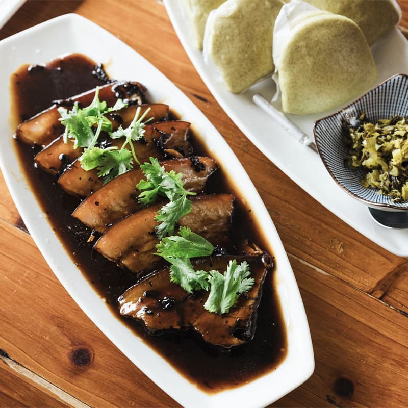 「天然茶莊」は山間部に位置し、自家で有機栽培した茶葉を使用して、茶葉雞湯(茶葉鶏スープ)や老包種茶醉蝦(老包種茶の酔っ払いエビ)など、茶葉を使った料理を提供しています。なかでも看板料理の「觀音自在煨東坡肉(観音自在・煨東坡肉)」は、濃厚な鉄観音茶が豚肉の脂っこさを和らげ、さらに包種茶粉で作る刈包(割包)と合わせることで、生地の茶の香り、滷肉醬の香ばしさ、酸菜の酸味、香菜の独特の香りが幾重にも重なり、豊かな味わいを織り成します。一口食べれば記憶に残る深い余韻が広がります。