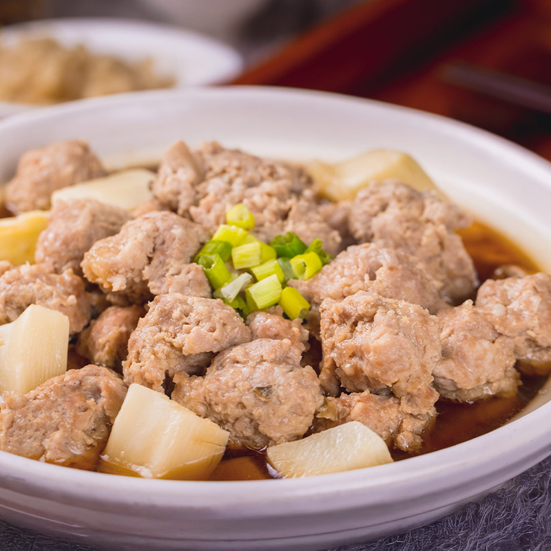 「小半天風味餐坊」は、南投県の有名な産茶地・鹿谷郷に位置し、地元で採れた新鮮な食材を味わってもらうため、料理はおまかせ(無菜單料理)スタイルで提供し、一部の看板料理のみを残しています。看板料理のひとつ「醬筍肉丸子(醬筍入り肉団子)」は、自家製の醬筍を練り込んだ肉団子を、地元特産の麻竹筍(マチク)とともにオイスターソースで煮込んだもので、柔らかく塩味の効いた味わいはご高齢の方にも食べやすい一品です。