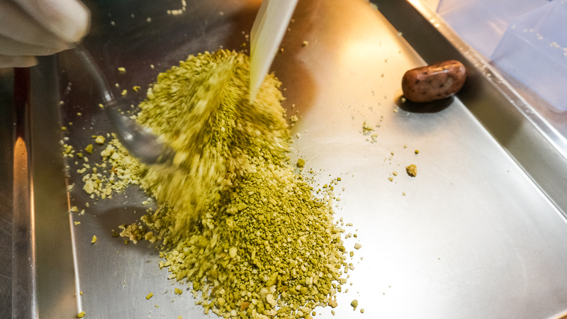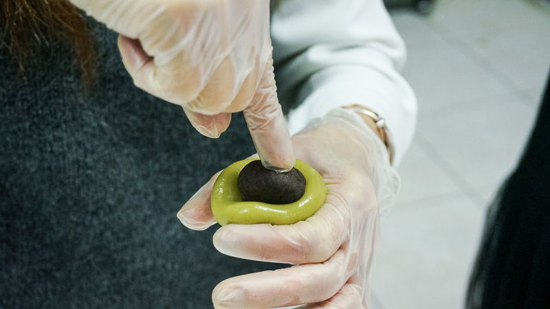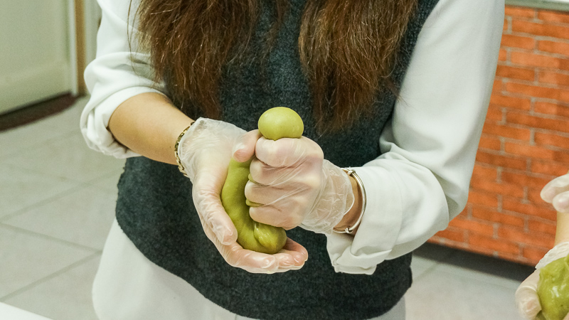 The ingredients are already prepared to save the hassles, and visitors simply mix the green bean kernels and green tea powder then choose their moulds to fill in the fillings. The final step is to put the cake into the mouth and savor it. The steps may sound easy, because Mrs. Hung has conducted enough experiments to make it simple. There are still many tips to learn during the process.