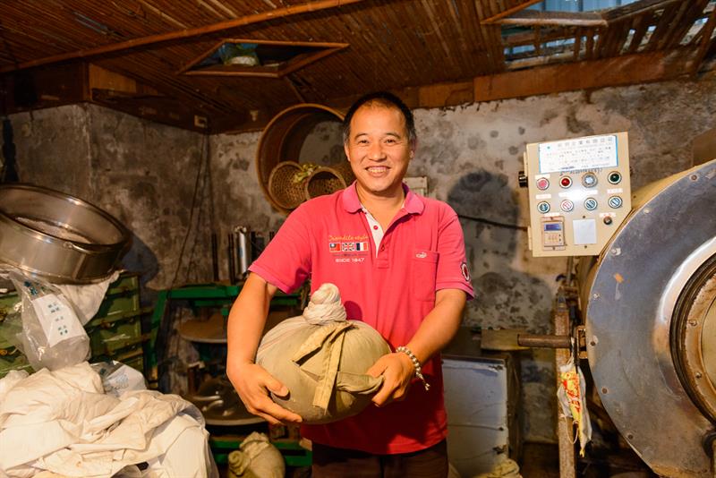 製茶室に入るといくつもの白い布で包まれた球状の物体を見ることができます。好奇心からこれが何か尋ねてみました。張福欽氏はその場で本物の技を見せてくれました。手と足を両方使いながら熟練した手で茶を解きほぐし、またすばやく白い球状へと包み込むのを見るだけで、驚きまた珍しく感じられました。もともと茶葉は「殺菁」を経過すると、茶自体が柔らかくほぐれるのです。しかしやはり平らな状態であり、よじれた紐状にはなっていません。必ず「揉捻」または「団揉」のステップを踏む必要があるのです。茶葉は圧力と揉む力を受けて液体がにじみ出します。お茶を淹れる際にお茶の要素が容易に熱湯のなかに溶け出すことで、お茶の風味が強化されるのです。これらの製茶のプロセスはどれも、半発酵の茶類のユニークな風味を形成するのに重要なステップなのです。