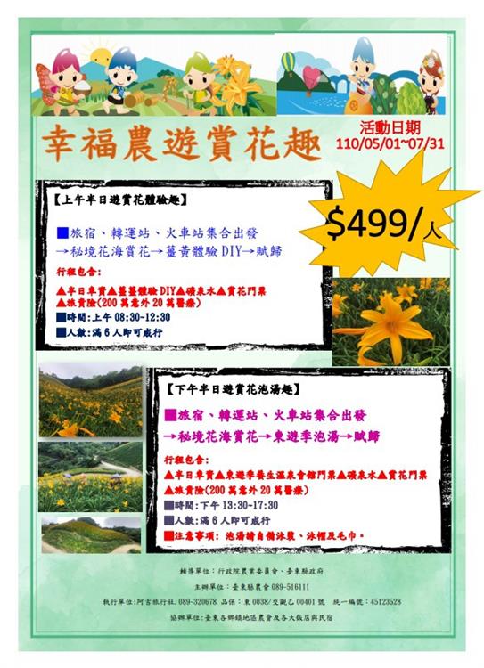 下半遊:▲半日車資▲東遊季養生溫泉會館門票▲礦泉水▲賞花門票▲旅責險(200萬意外20萬醫療)