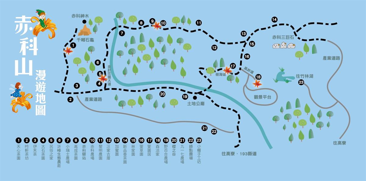 ✔ 自行開車-請在台9線271.5KM處向東轉,直行經高寮大橋、193縣道後,進入高寮社區,沿著社區道路直行,接產業道路上赤科山,約20~30分鐘可抵達;花季期間實施交通管制,遊客勿駕駛9人座以上巴士、大客車上山。
