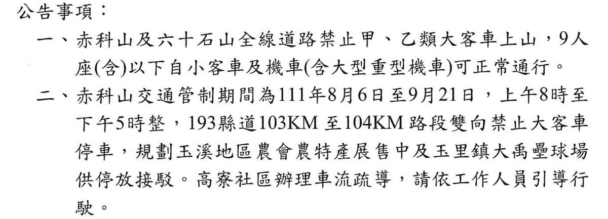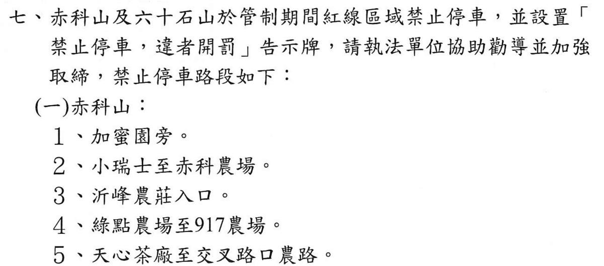 赤科山於管制期間每日早上8時至下午5時,紅綠區域禁止停車,並設置「禁止停車,違者開罰 」 告示牌 ,請執法單位協助勸導並加強取締,禁止停車路段如下 :