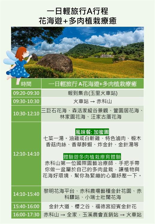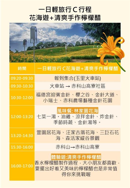 3. 本體驗活動已將時間安排於每年金針花盛開旺季,且金針花屬自然景色,受氣候影響,非人為所能控制,如花況未如預期,則依原行程前往參觀,恕不退費,敬請見諒。