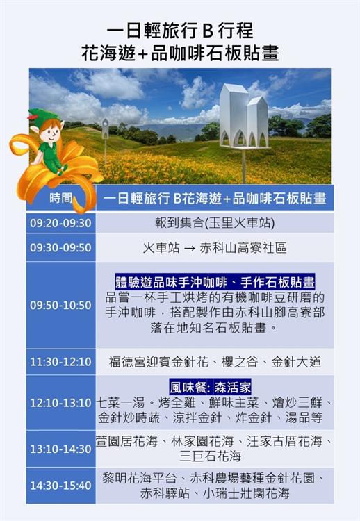 2. 因此行程為合團合車制,為了不影響其他遊客權益,請確認預定台鐵車次於集合時間9:30前抵達玉里火車站。