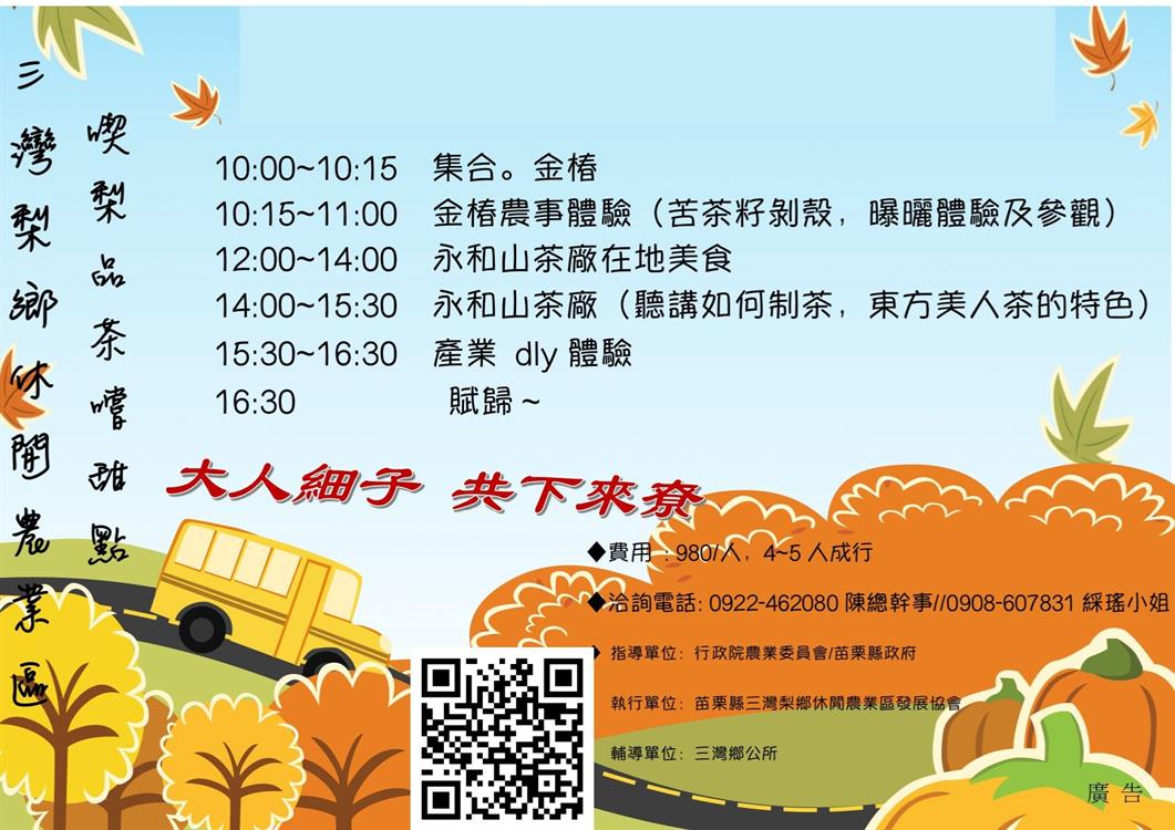 想要體驗樂活農村的慢遊氛圍,不妨走一趟三灣梨鄉休閒農業區!四周視野遼闊擁有非常壯麗的景觀,來到這裡不但可體驗採果、生態觀察的樂趣,還可悠然騎乘自行車欣賞農村風光,亦或沿著登山步道深入山林感受芬多精的洗禮,為具豐富休閒農業遊憩資源之新竹、台中後花園。