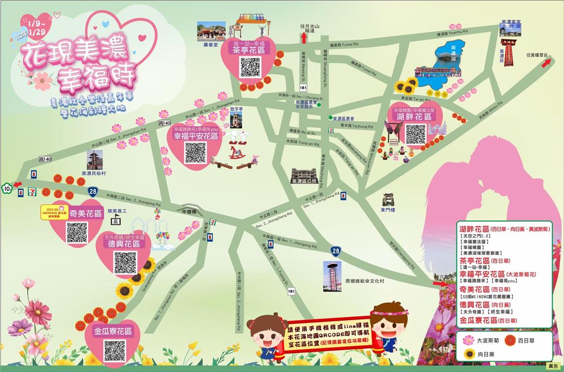 今年獨創以「幸福」為主題,規劃六大花區,包括幸福平安花區、茶亭花區、湖畔花區、奇美花區、德興花區、金瓜寮花區,現在就來美濃踏青賞花 。