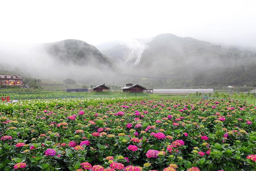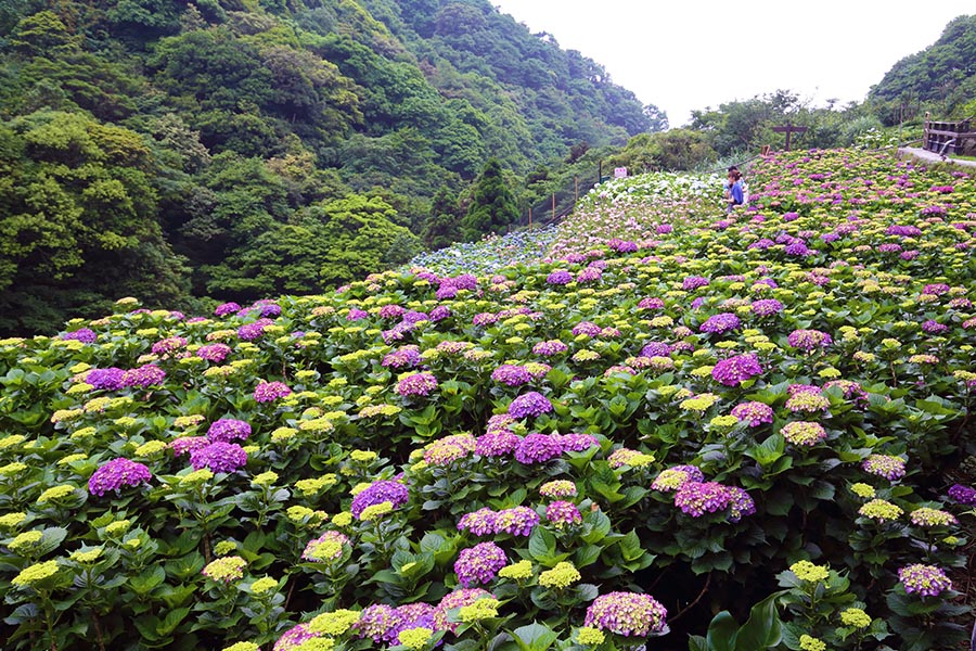 竹子湖繡球花有17至18個品種,花色多樣,每年農園配合活動主題發揮創意設計的地景花藝,相當精采也是熱門打卡景點。