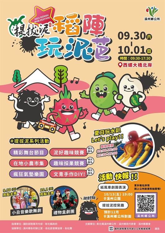 活動日期| 112年09月30日 (六) - 112年10月01日 (日) 活動時間|09:30-17:30 活動地點| 📍溪州鄉水尾村西螺大橋北岸 (西螺大橋前端) 趣味活動| 點我報名去 👇👇 🔶【泥漿拔河賽】 🔶【泥蟲向前衝】 🔶【奪寶泥戰】 🔶【提芭泥冒險王挑戰賽】 照片來源 : 溪州鄉公所臉書