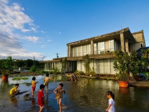 往裡走有一戲水區,設置了許多童年時在鄉間常見的汲水幫浦,夏天時孩子們光腳浸在池裏打水仗,兩方互相噴灑水柱,嘻笑聲此起彼落,清涼又消暑。另一側則是泡腳池,裏面養著許多小小魚,當你把腳放內池中,魚兒就會蜂湧靠近腳邊、輕咬皮屑為食,據說還有去角質的功效呢!園區旁緊臨一條灌溉水圳,清澈沛然終年不息,是供給此區農作的重要水源,水邊種滿了野薑花,開花之際白花綠葉倒影在流動的水面,剎是好看。農場也在圳上搭起小拱橋,水邊也設了幾座秋千,在此取景彷佛置身莫內的花園,怎樣拍都上相。
