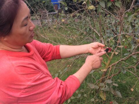 採收水果看似簡單,但其中可有大大的學問在裡面。由於鳳梨葉的邊緣相當鋒利,一不小心就會被割傷,所以必須先穿上防割傷的衣著,再戴上手套防刺傷。之後以一隻手托住鳳梨的下方、另一隻手往下折即可。這步驟說來不難,需要花費一點力氣才完成,對沒有摘鳳梨經驗的人來說,可能容易失敗。「熟能生巧」這話一點都不假,果農們多年的功力實在令人佩服!