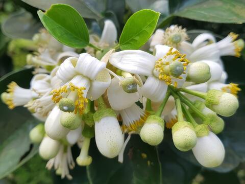 柚花通常成簇的生長在枝條頂端,含苞的柚花呈子彈狀,花開後雪白花瓣反捲,通常有四瓣,但有時也會出現三、五、六瓣的柚花