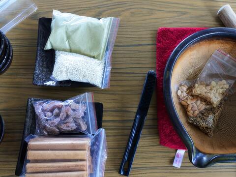 綠茶糕標準配備「六宮格的材料」,內有綠豆粉、綠茶粉、川貝陳皮、金棗內餡