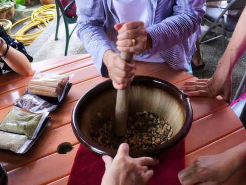 除了體驗採茶、油炸茶葉的活動外,這裡有充滿客家風情的「柚花養生擂茶DIY」,首先將紅豆、杏仁、花生、白黑芝麻、柚香綠茶粉等材料放入擂缽中,用擂棍擂成末,最後加入熱柚花茶水沖泡即可飲用。三五好友、親子一起擂茶,別有一番滋味!若是玩累了想坐著歇會兒,可以砌壺春茶,品味季節鮮採的原味。