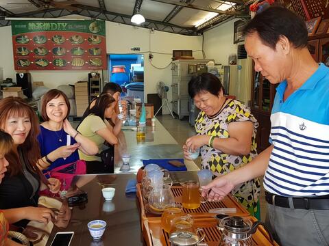 芳岳茶園種茶起家,手藝精湛的老闆娘拿出手工製作的金棗蜜餞、脆梅、嫩薑片等,配上現泡各式茶品供大家品嘗,一群人說說笑笑度過愉快的午後時光。