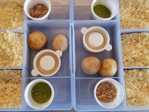 除了種茶,芳岳也推出許多手作體驗活動。我們先把綠豆粉、綠茶粉融合搗碎,加入川貝陳皮,用白色模版反覆拌勻,將球狀內餡搓揉成長條狀切成六小塊,將搗好的材料放入模具最底層,然後鋪上一層餡料,再補滿填平。選定想壓模的圖案,用大拇指往下壓到底,順勢拉起模具左右耳,綠茶糕就塑型完成,很有成就感!