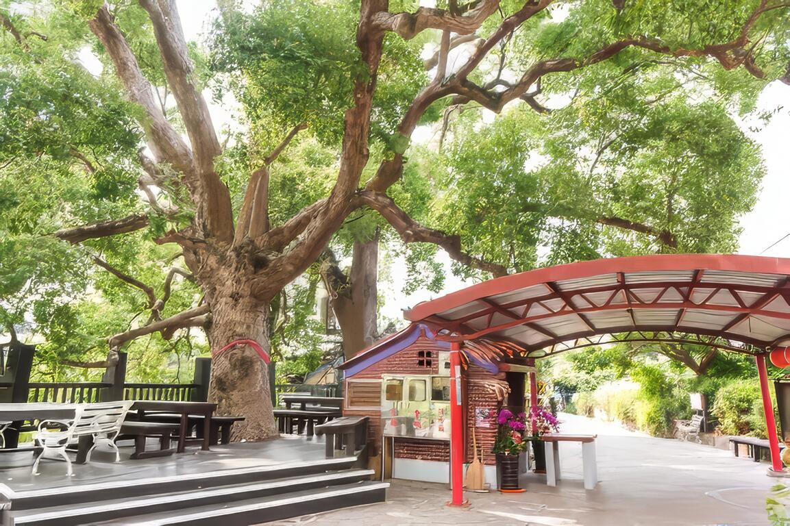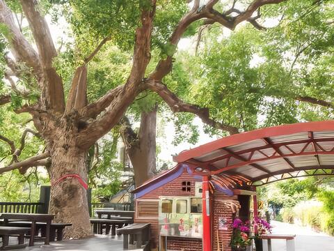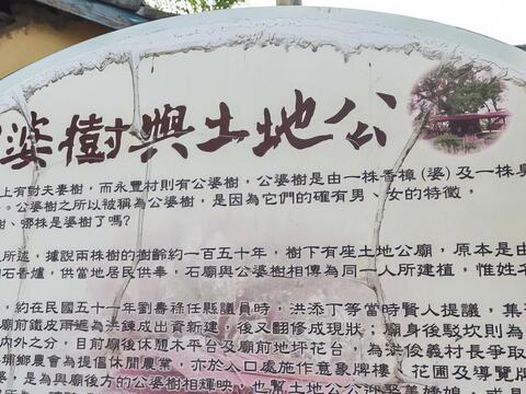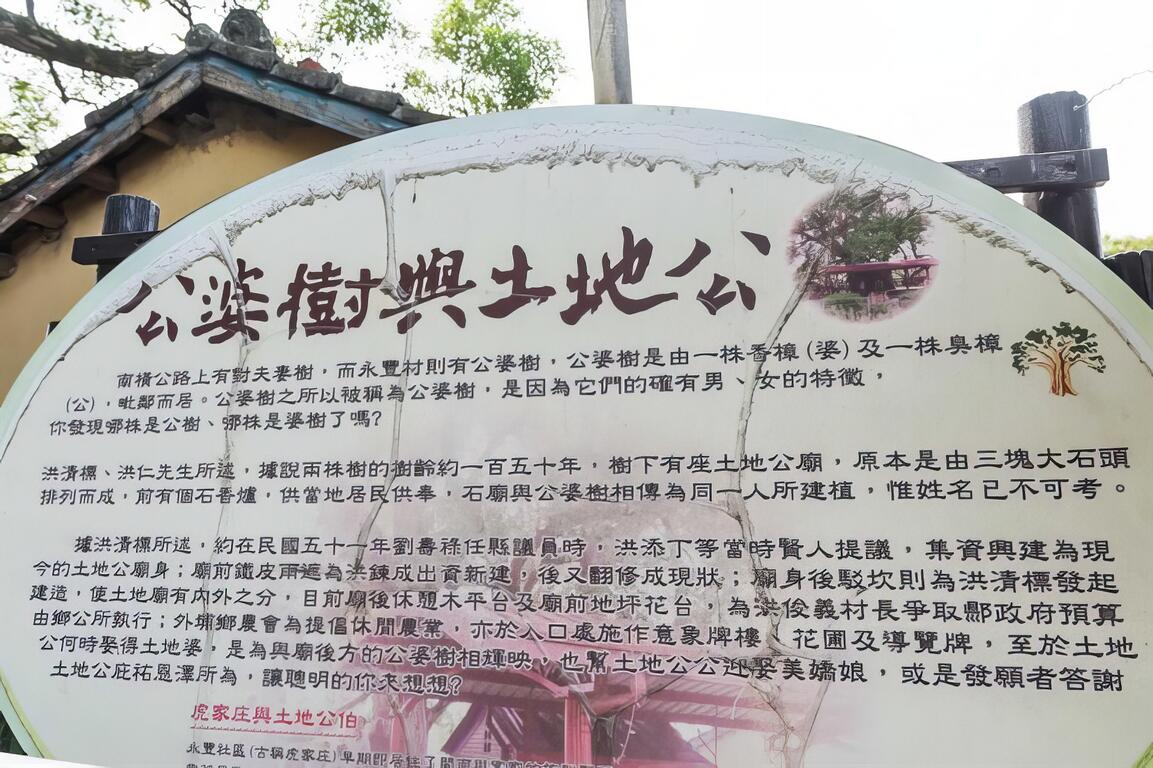 距離農夫市集不遠處,有個茂盛的樹型高出旁邊的景物,這就是當地民眾喜愛的公婆樹。這兩棵樹齡達160年左右的樟樹,其中公樹為臭樟,婆樹為香樟;兩樹比鄰而長,樹型高大成蔭,樹下自然成為聚會場所。如果不趕時間,可以在樹下坐著乘涼,感受微風吹撫,和在地居民聊聊天。一旁的土地公廟祭祀土地公和土地婆,是民眾精神信仰所在。