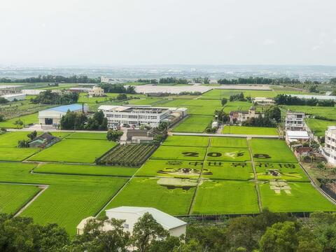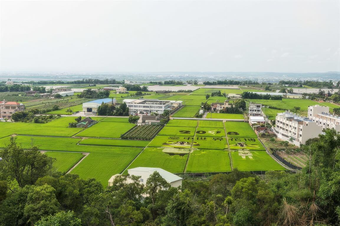 來到地勢高的觀景台,向前望去可以看到濱海的風力發電機,以及遠方通霄電廠、大甲等地。而下方稻田中有2018年的新彩繪,以台中石虎為主角,利用不同顏色的水稻在綠田中畫出兩隻可愛彩繪石虎。虎爸虎媽帶領大家一起歡迎2018年台中世界花博活動,兩隻石虎預計停留到六月底稻米收割之前,來到外埔時,記得來此拍照留念囉!