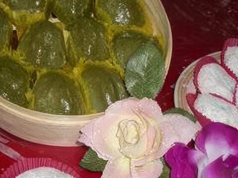 米國學校田媽媽餐廳製作的「艾草糕」使用新鮮艾草將粿染色添香,外皮油亮光澤,有如麻糬般Q軟;內含豐富餡料:蘿蔔絲乾、絞肉、香菇、油蔥、蝦仁,吃下去香氣四溢,讓人無法抗拒!