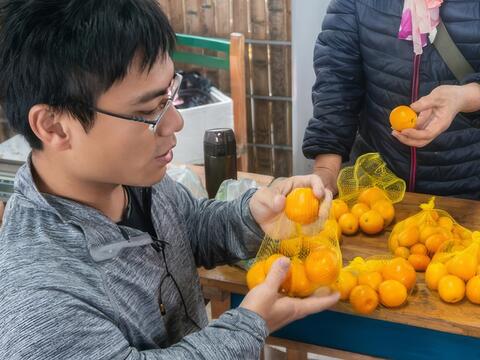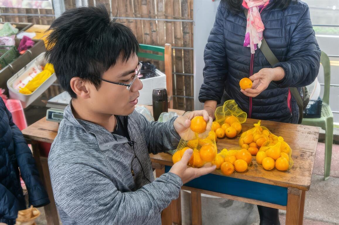 圖說:大山背農民市集,莊凱詠介紹農產品,這是筆者最愛的「黃金橘」,之前沒嘗過果皮比果肉更好吃的柑橘類水果。