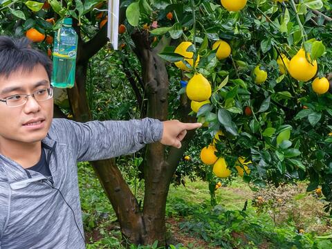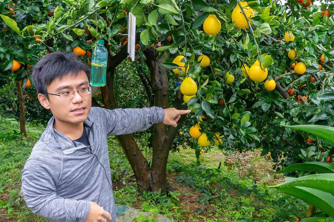 圖說:老大份休閒農場,莊凱詠介紹果園內最特別的柑橘樹,印象沒記錯一顆樹接枝後至少有五種柑橘。