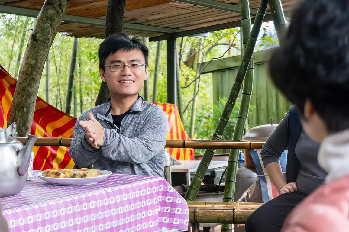 圖說:老大份休閒農場,莊凱詠與我們介紹橫山鄉茶的故事;除了柑橘外,後方看到的竹林,夏天此地也有提供採竹筍的體驗活動喔。