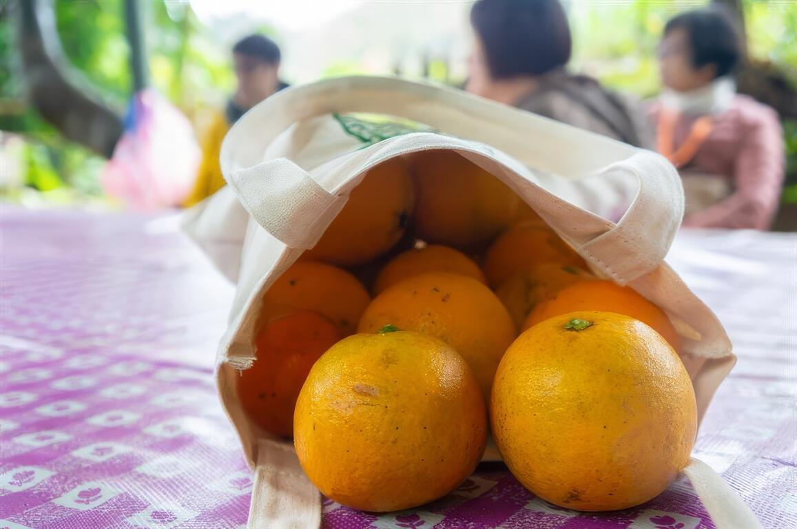 圖說:老大份休閒農場,採果嘍~每人提供一個帆布袋讓我們裝柑橘。