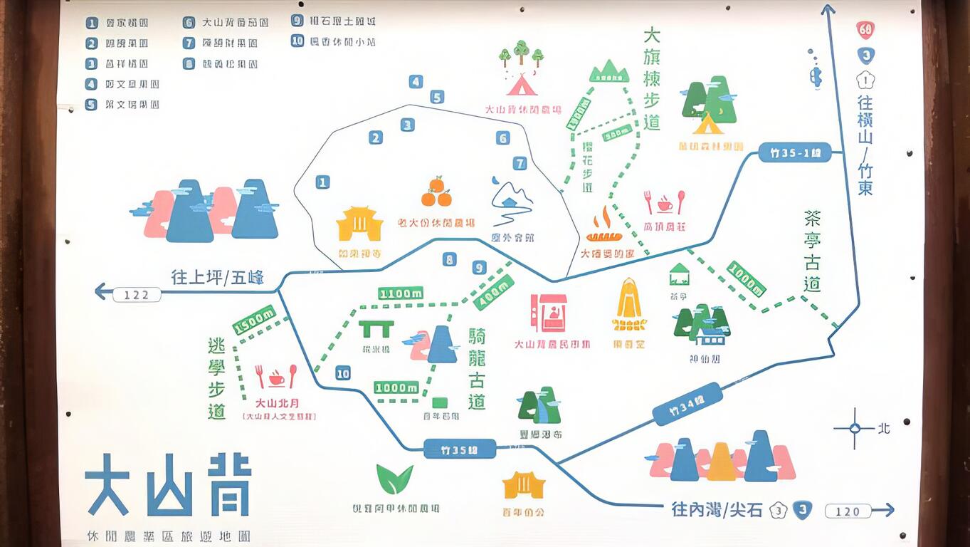 「柑橘故鄉一桔五吃」 行程,前往位於新竹縣橫山鄉大山背休閒農業區中的各景點,在大山北月創辦人莊凱詠的導覽下,從橫山火車站開始,分別前往落羽松祕密景點、橫山百年古廟大山背樂善堂、大山背農民市集、老大份休閒農場、大山北月,最後並在大山北月度過充滿五感體驗的午後時光。