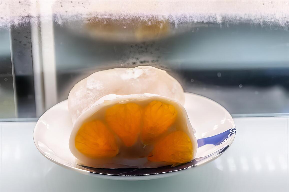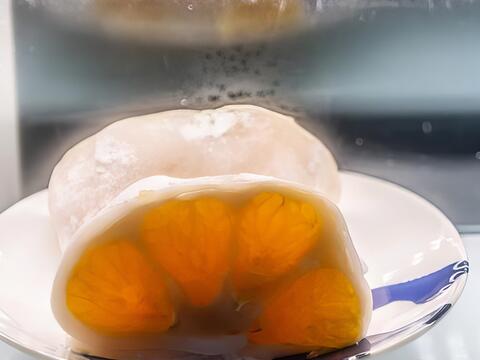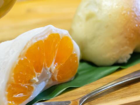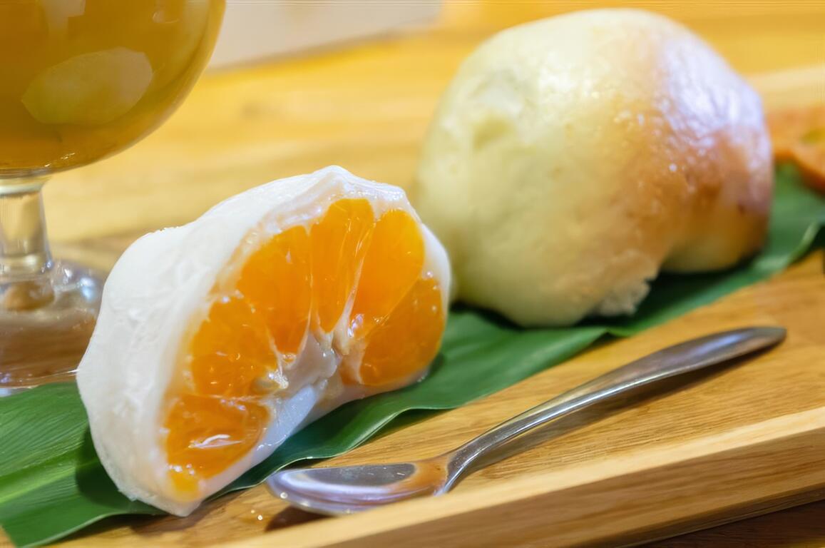 圖說:大山北月,一桔五吃-橘子大福,整個橘子包在手作麻糬裡變成一顆大圓胖胖的橘子大福,和一般想像中的常見草莓大福顯得視覺感更豐富;軟Q中帶著橘子果香,吃起來清爽又特別,是個沒有想像過的組合。