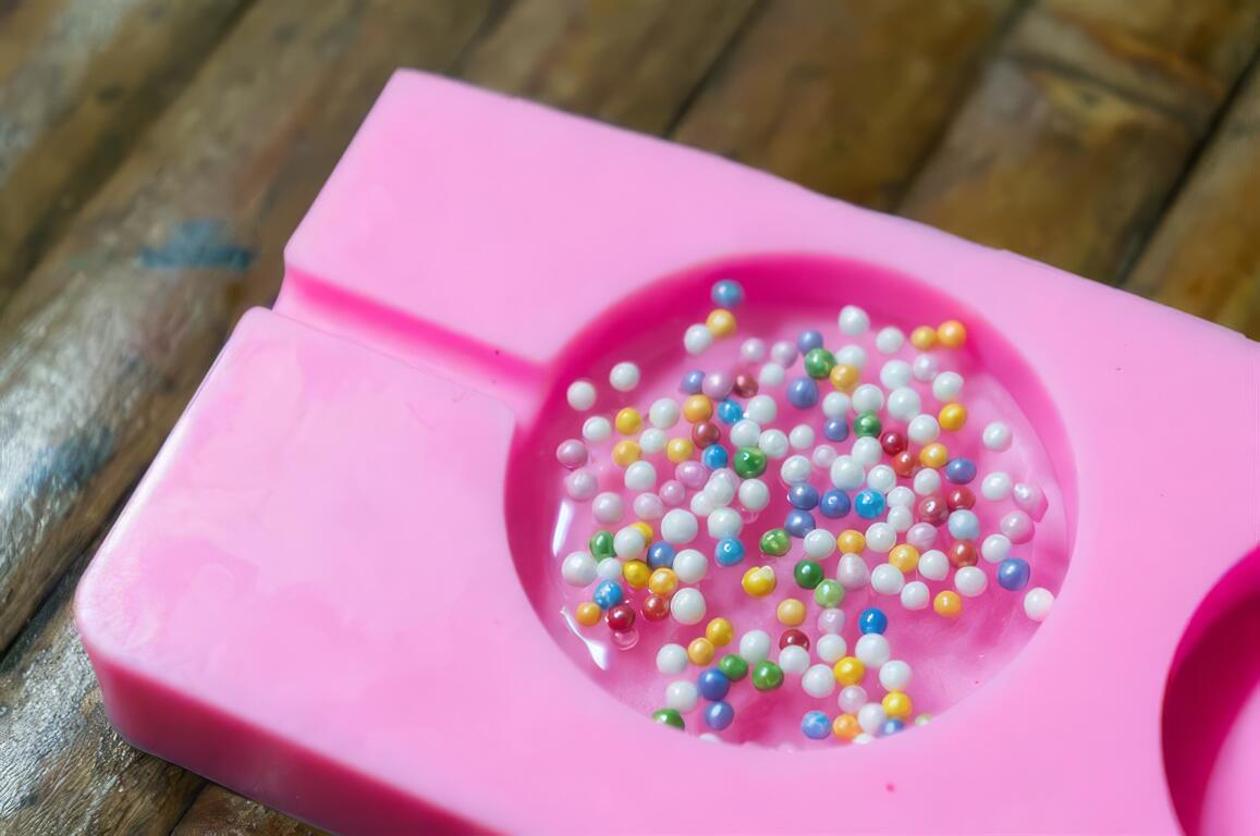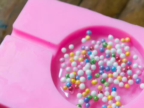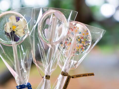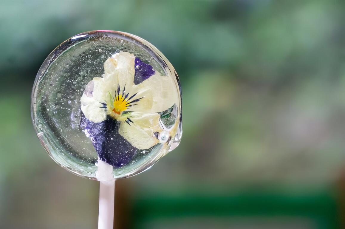圖說:大山北月,押花棒棒糖DIY,同樣也可放入其他可食用原料,如圖中的繽紛糖珠增加視覺色彩。