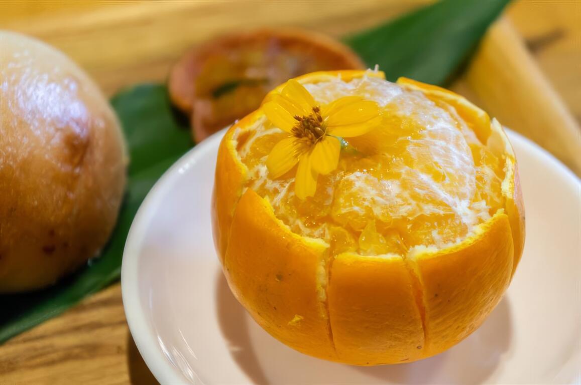 圖說:大山北月,一桔五吃-橘子暖暖包(烤橘子),這是筆者第一次吃到「熱」的橘子,經過烤過的橘子配上花蜜香,口感比起單純以「水果」享用,更像是在品嘗「料理」;「單純」又「豐富」。