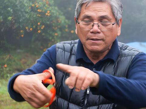 圖說:老大份休閒農場,負責人楊名遠示範正確剪枝方式避免袋內碰撞不易保存。