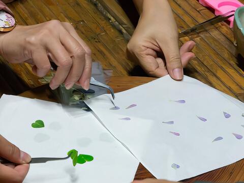 圖說:大山北月,押花棒棒糖DIY,怕一開始就押花會失敗,先用可食用的葉子當作練習。