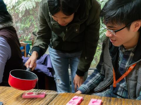 圖說:大山北月,押花棒棒糖DIY,先將液狀食用糖倒入模具中約一半的高度。