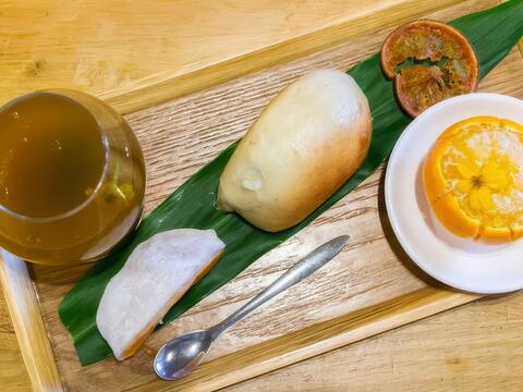 圖說:大山北月,一桔五吃,由右而左包含冰糖蜜橘、橘子暖暖包(烤橘子)、桔香貝果、香桔水果茶、還有超特別的「橘子大福」。這以不是單純的水果餐,而是結合視覺與嗅覺的感覺升級「農藝饗宴」。