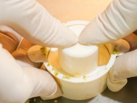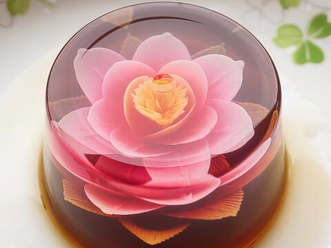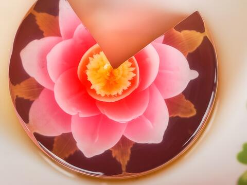 製作茶凍的過程中,會加入可食用的花朵,每朵花瓣由紅龍果調色製成、花蕊用槴子花或南瓜泥製作、綠葉則選用了抹茶,將這些食材巧妙結合,就能創造出獨一無二的美麗茶雕凍。