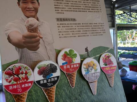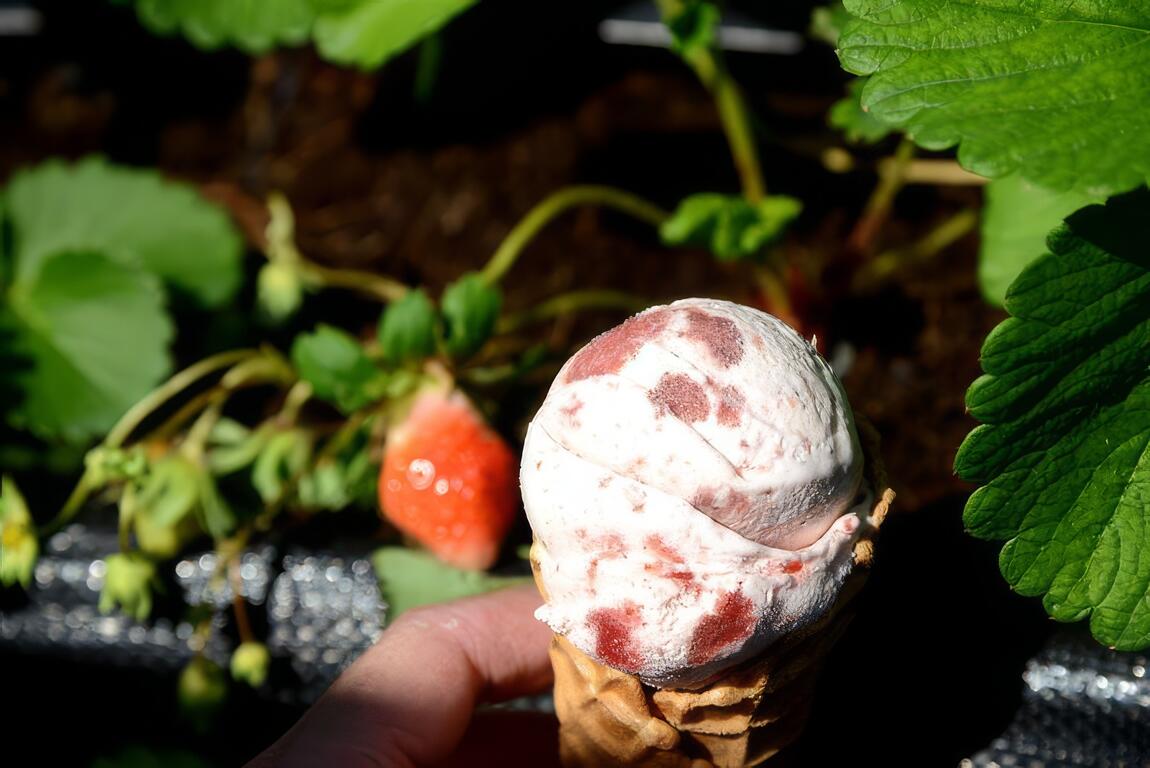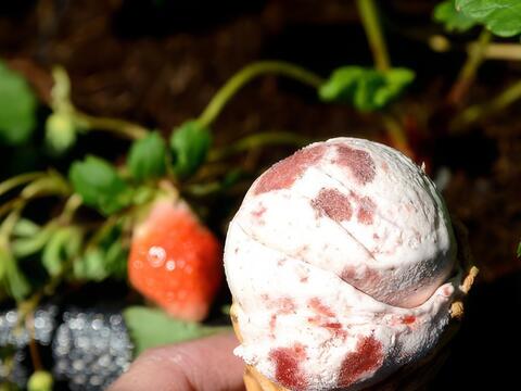 親山農園有個備受網友推薦的秘密武器,那就是「草莓果肉冰淇淋」,它的冰淇淋不是那種市售人工色素、化學香料的粉紅色草莓冰,而是用純正草莓果肉作成冰淇淋的內餡,孩子一見到誘人的冰淇淋,爭先恐後排隊嘗鮮。