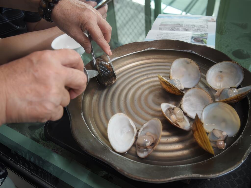 「哇!馬蹄蛤和掌心一樣大」,其體型比常見的蜆類大了五至六倍,品嘗一口清蒸馬蹄蛤的原汁,果然滋味鮮美。服務人員介紹道地吃法:「用湯匙挖著吃,這樣連旁邊的貝柱也可以吃到,尤其母蛤的黑色生殖腺含有大量賀爾蒙,有助於養生保健」。我們還點了馬蹄蛤養生湯、生蠔、火烤烏魚子、無毒蝦等,都是口湖出產的特色佳餚。
