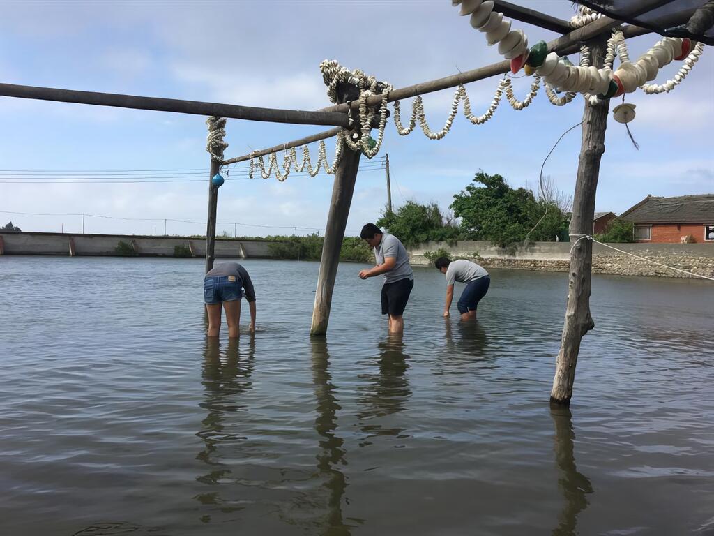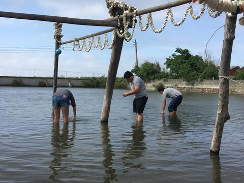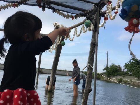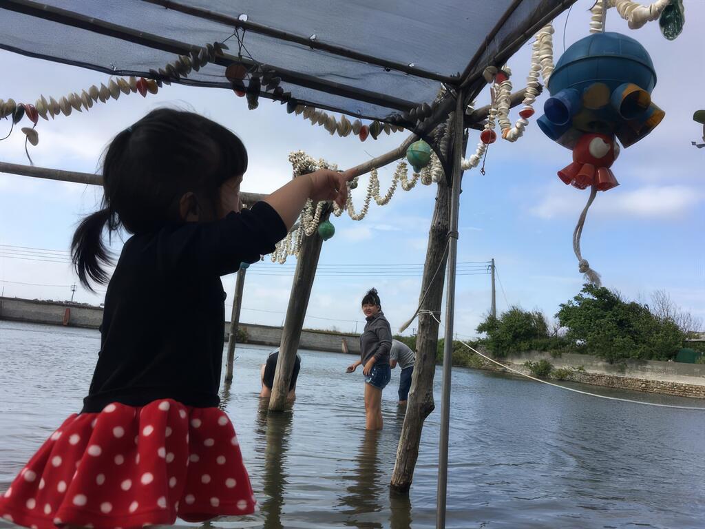光吃馬蹄蛤不過癮?馬蹄蛤主題館在佔地三公頃的漁塭區中,規劃出不同的體驗內容,例如戶外「摸蛤仔」的生態體驗,漁塭水深到小腿肚,年幼的孩童下水建議要有大人陪伴。當天逢寒流水溫較低,妹妹站在岸上指揮大人們尋寶,大人小孩都玩得不亦樂乎。