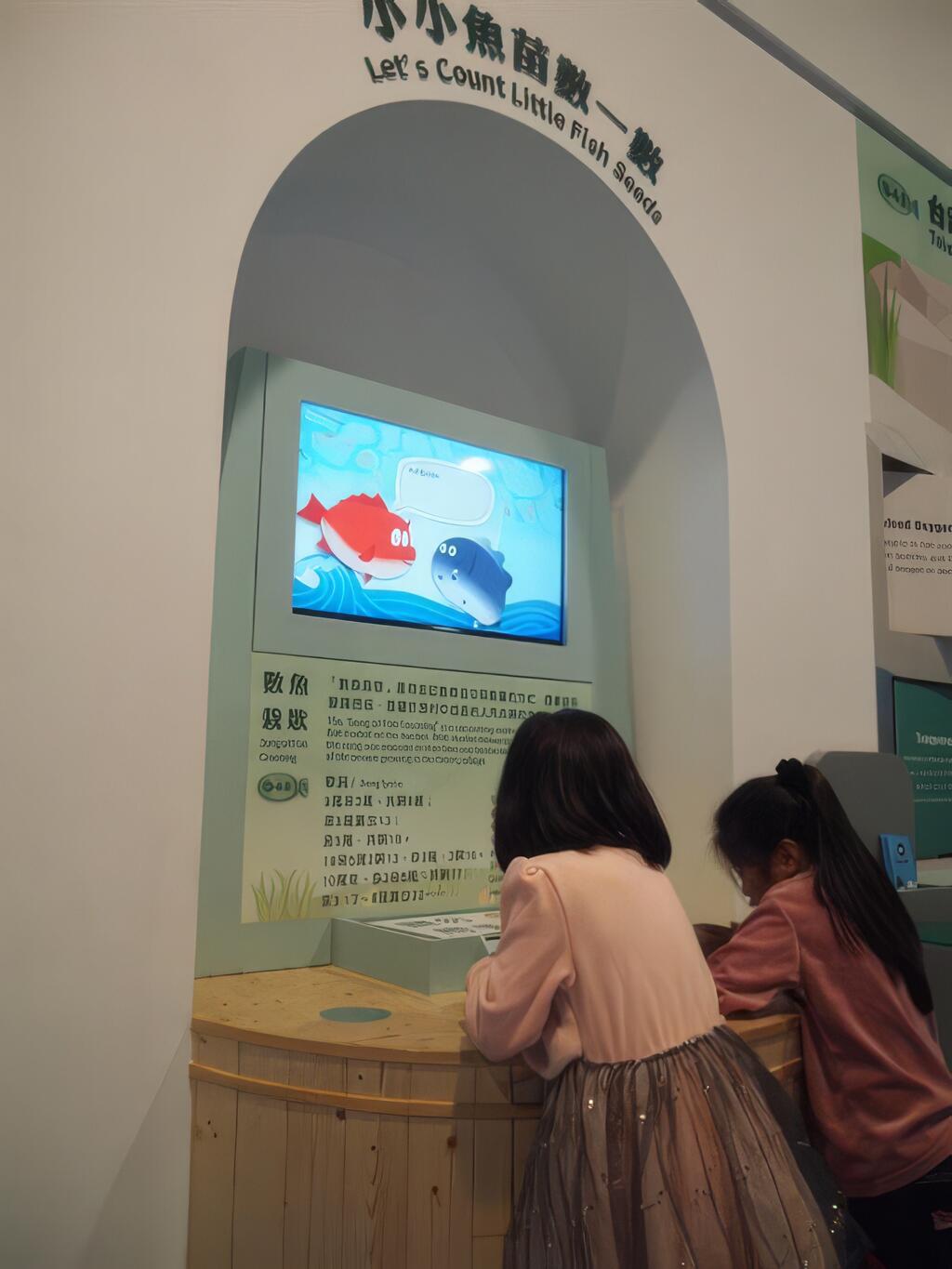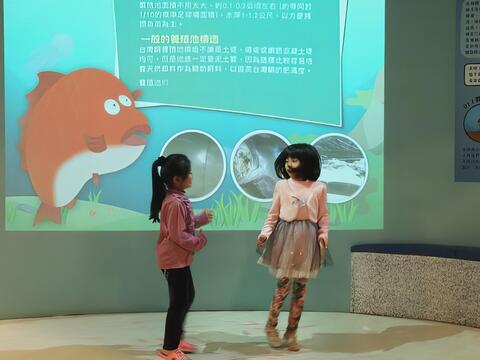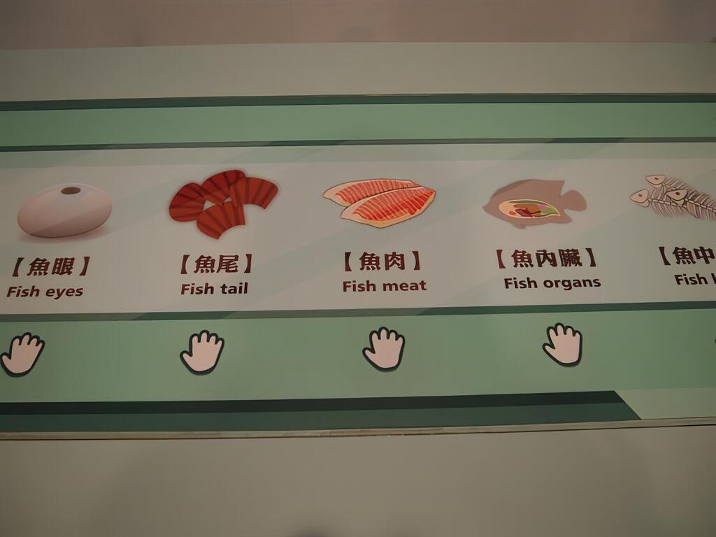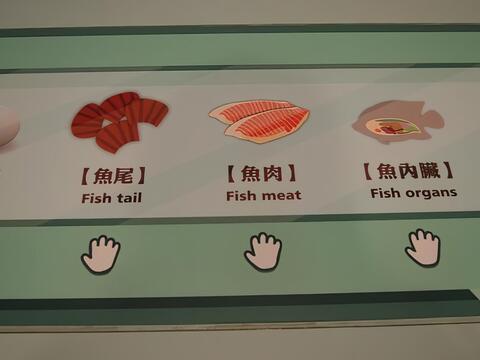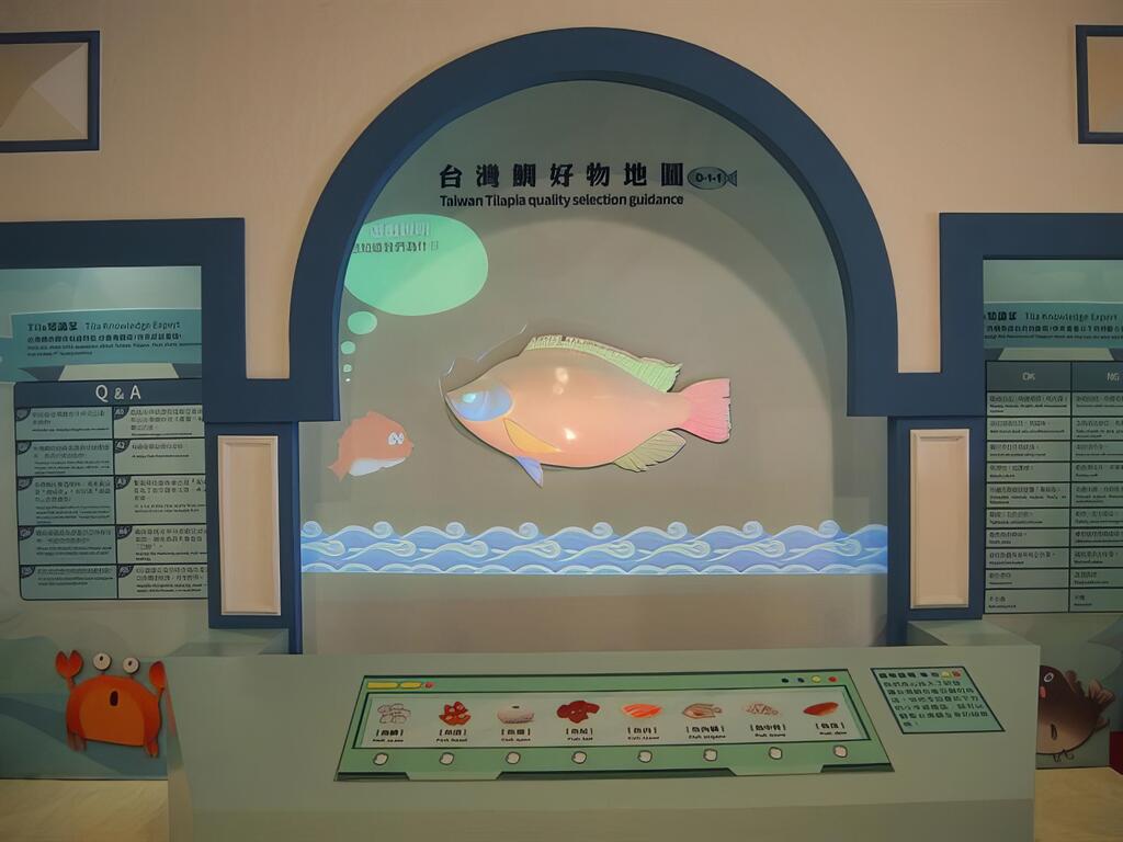 園區特別設計各式互動裝置,小朋友可以直接觸摸下方圖塊,只要輕輕一碰圖案下方的小手,上面的鯛魚就會發光,內建的語音導覽便開始介紹台灣鯛各部分結構與運用方式,讓小朋友就像上了一堂自然課。