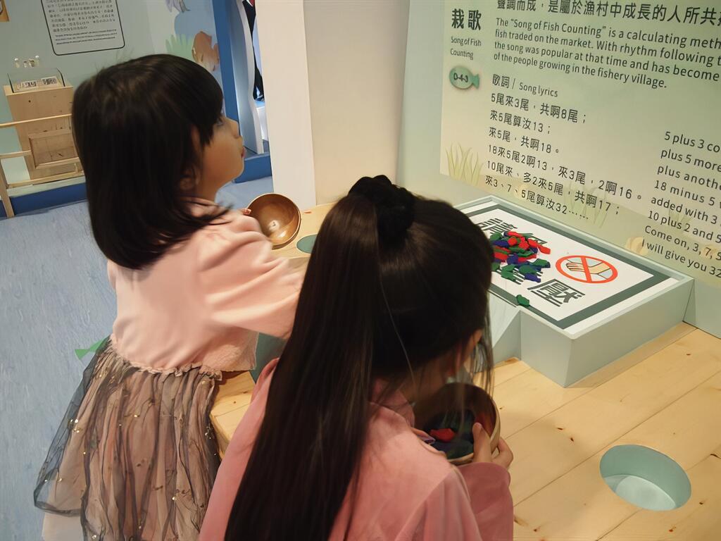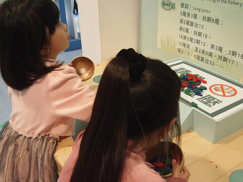 小朋友聽著雲林以前古早的數苗歌,邊拿些魚苗放在碗中,將魚苗放上磅秤。「數魚栽歌」是用來記數魚苗交易的方式,隨著語言音調而成的曲目,體驗當時漁村生活共同的文化記憶。