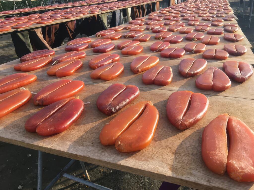 行經雲林口湖鄉街道,沿路可見一排排的烏魚子在做日光浴。每年10至12月的烏魚子採收季,大批攝影部隊前來此地取景,隱身巷弄的店家熟練地取出、洗淨烏魚子。都市長大的孩子,從沒見過金黃色、長條狀的新鮮烏魚子,覺得新奇,連我這個大人也大開眼界。漁民辛苦了一整年,誠心祈求上蒼保佑今年是個豐收年。