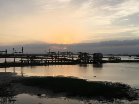 雲林臨海沿岸,有幾處濕地景點頗具盛名,其中以成龍濕地最為人熟知。三十年前,成龍村的農地因超抽地下水,導致地層下陷,加上風災侵襲,引發海水倒灌變成濕地。近年投入生態復育,成龍濕地搖身一變成為水鳥的天堂,歷年在此舉辦國際環境藝術節。今年五月以水為題,邀請國內外藝術家運用竹編共同創作,裝置藝術意外成了觀測水鳥生態的掩護所,夕陽餘暉下的濕地景觀別有一番風韻。