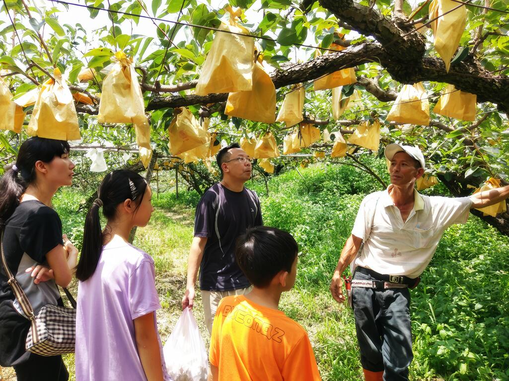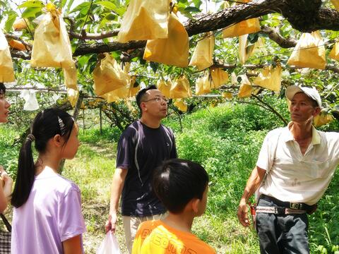 果園主人詹大哥細心講解,如何透過紙袋判斷梨子的成熟度,他說:「熟成的梨子是黃色光澤,只要仔細觀察紙袋,微微透出一點黃色就可以採收」;非採收期間,果農們忙於田間作業工作,如整土、如何讓梨樹不要長太高,又不會因為樹枝壓低而太容易掉落、架設梨園支架的方法,以及手續繁複的嫁接梨穗(或稱花苞)過程。