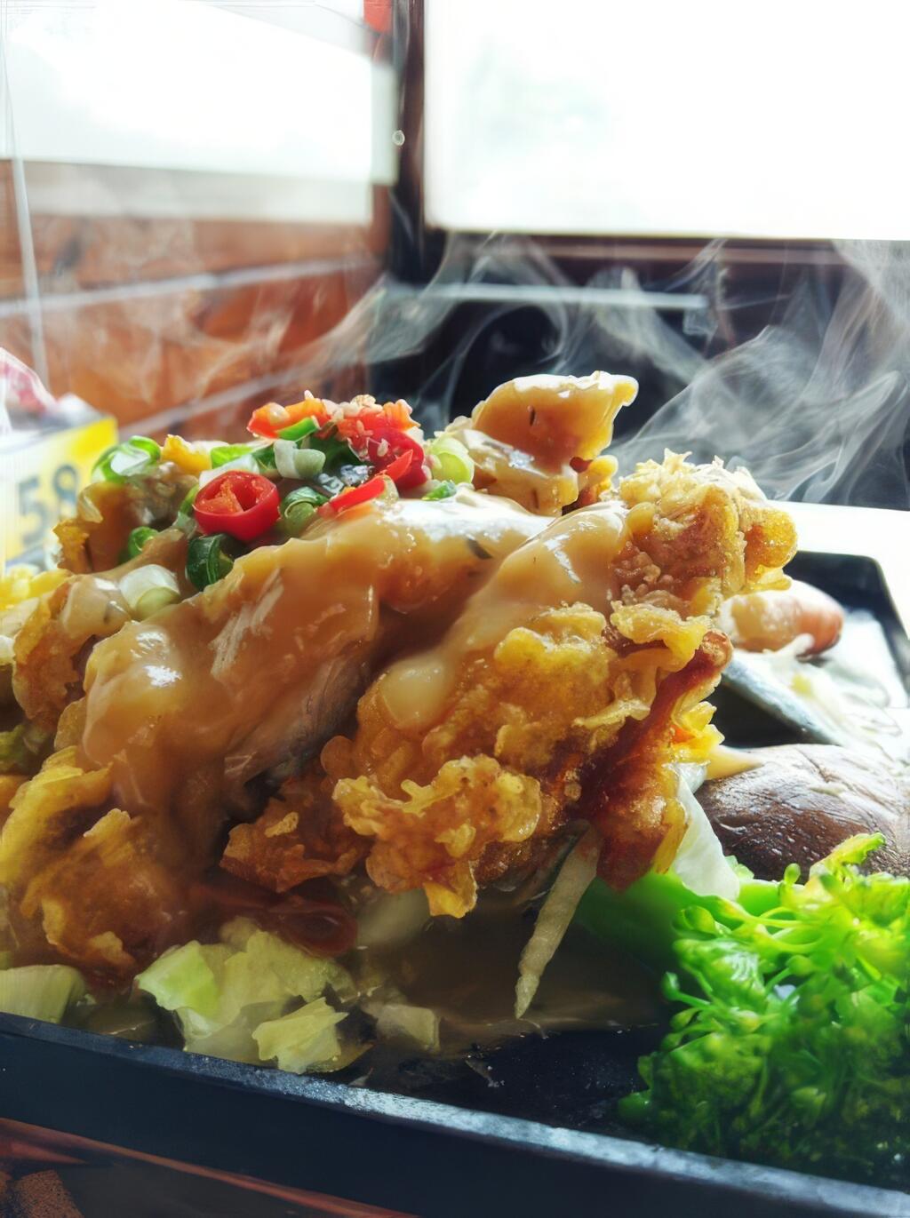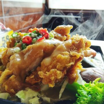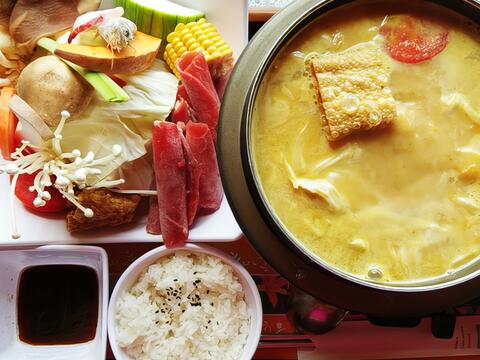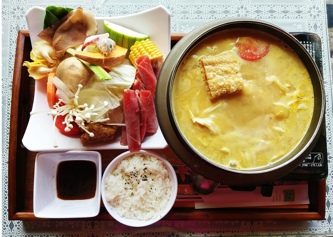 過了一會兒,我們點的「南瓜鮮蔬鍋」和「香茅檸檬雞腿排餐」來了!滾燙的南瓜鍋飄著香氣,湯頭濃郁,一撈就發現滿滿的南瓜。吃下去更是不得了,真的超好吃!南瓜可說是該店極具代表的菜色,門口擺設南瓜相關飾品,櫃檯也有賣他們自己種的南瓜。