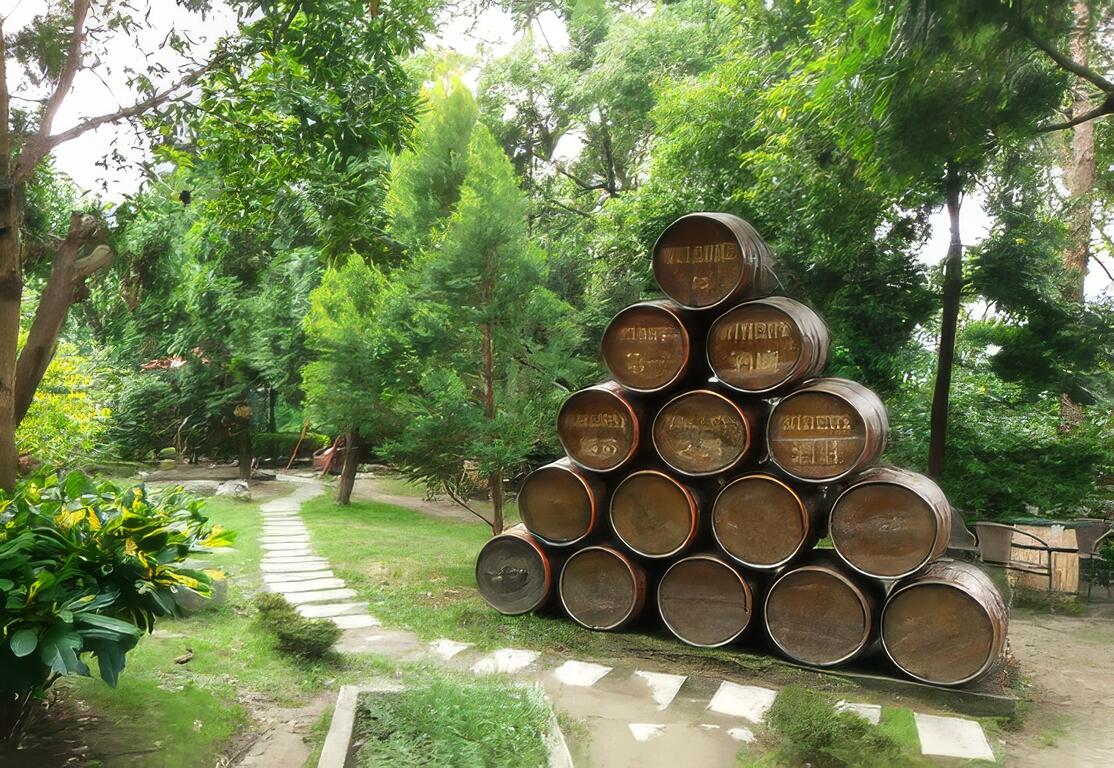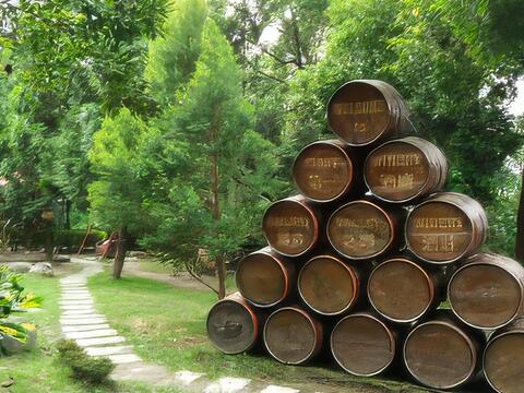 沒多久就到了「第一酒廠」,有著歐洲的城堡外觀,廠內整理得很莊園風,最棒的是入場不用購票,還有免費的酒可以試喝。我當天喝了梅子酒、荔枝酒,喜歡甜酒口味的朋友千萬別錯過了。此外,別出心裁的酒廠佈置,採用酒桶堆疊或重新塑型,如行人座椅的椅腳、酒桶盪鞦韆等,園區裡還有火車可供旅客拍照留念。