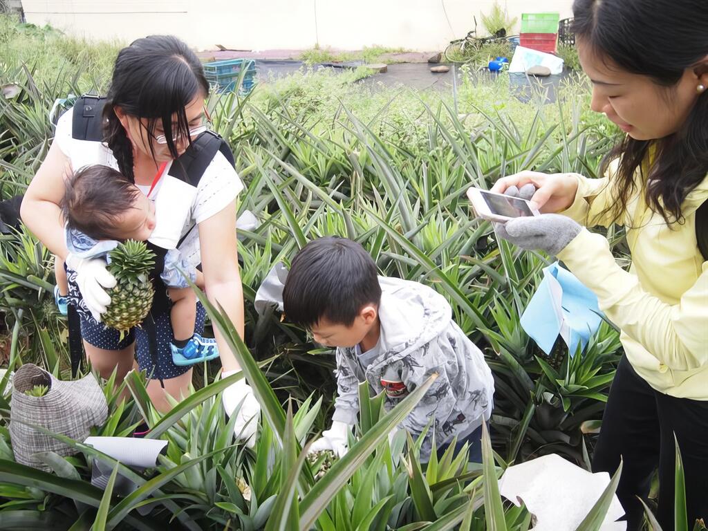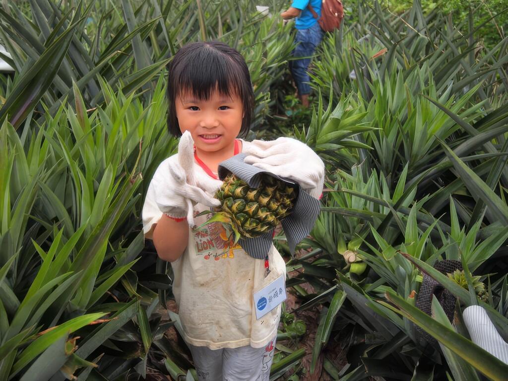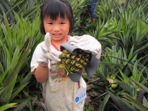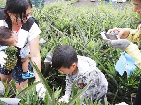 工作人員在田裡邊講解邊示範採鳳梨,一手托住鳳梨底部,只要左右一扭、用力一拔,聽到「啵」的一聲就能摘下來。看似簡單的動作,實際上要花不少力氣,孩子拔出他的第一顆鳳梨,開心地大叫。