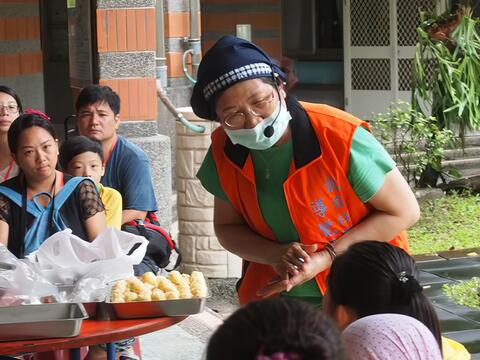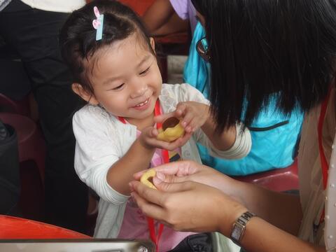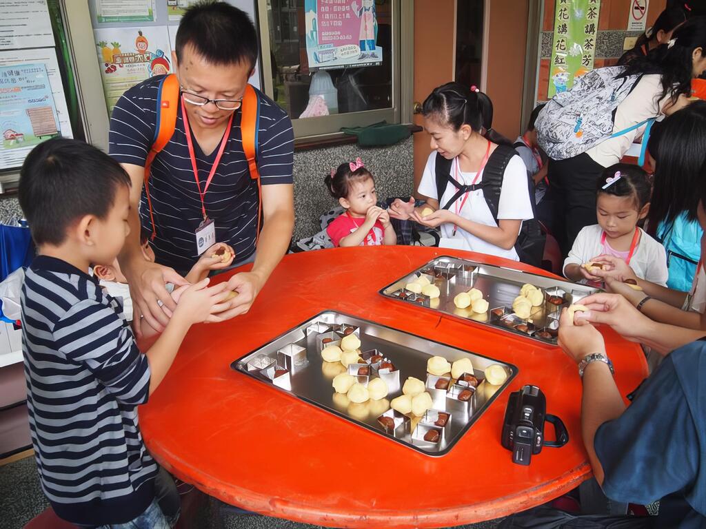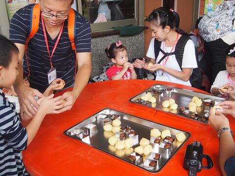 除了摘鳳梨外,還有一連串製作鳳梨酥的親子體驗。老師說鳳梨酥內餡主要材料為鳳梨果肉和麥芽糖,按經驗加入牛油,再用慢火熬煮後再冷藏,費時約兩小時。為了縮短作業時間,工作人員一早先備妥內餡、麵粉等材料,遊客只要運用這些材料、模具,親手搓揉成鳳梨酥。